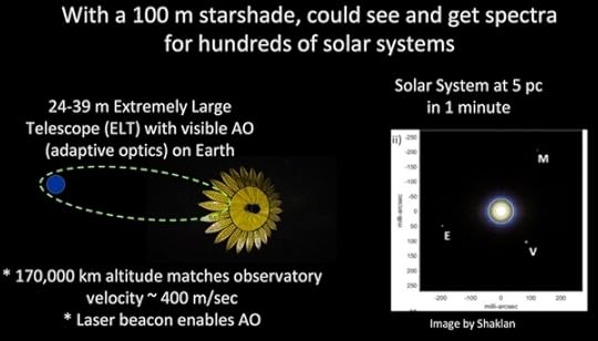 And what a positioning challenge this is in order to maximize angular resolution, sensitivity and contrast, with the starshade matching position and velocity with the telescope from an orbit with apogee greater than ~ 185,000 km, thus casting a shadow of the star, while leaving the light of its planets to reach the instrument below. In addition to the active propulsion to maintain the alignment, the concept relies on adaptive optics that will in any case be used in these ground instruments to cope with atmospheric distortion. Thus low-resolution spectroscopy becomes capable of analyzing light that is actually reflected from Earth-like planets.