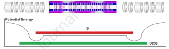 The antiprotons oscillate along the trap axis across a smaller distance, reflected by a negative potential “hill”. In this reflection region the positively charged uranium ions are accelerated to a higher kinetic energy. Beyond the antiproton reflection region a larger positive potential hill is established that subsequently reflects the uranium ions. Because the two particle species must have equal velocity in the central region of the trap, and the fact that the antiprotons have a charge density of -1/nucleon and the uranium ions have a charge density of +1/(238 nucleons), the voltage gradient required to reflect the uranium ions is roughly 238 times greater than that required to reflect the antiprotons.