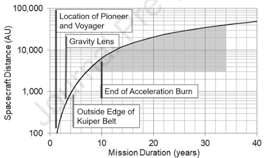 Image: This is Figure 7 from the paper. Caption: Potential early science return milestones for a spacecraft undergoing a 10-year acceleration burn with a cruise velocity of 0.02c. Credit: Gerald Jackson.