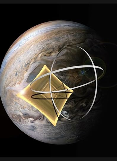Figure 1. The Wind Rider on a flyby of Jupiter. The solar panels are hidden behind the sun shield facing the sun. The 16U CubeSat chassis is at the intersection of the 2 coils and sun shield.