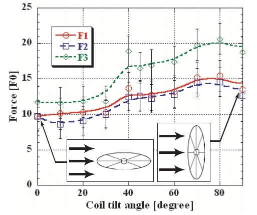 Figure 4. Force on the coil effected by angle of attack. A near 90 degrees angle of attack increases the force about 50%.
