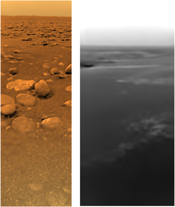 Image: What we do know. This is Figure 1 from the paper. Caption: Dragonfly will image from the surface to provide context for sampling and measurements, as well as in flight to identify sites of interest at a variety of locations. (Left) Huygens image of Titan’s surface; cobbles are 10–15 cm across and may be water ice (Tomasko et al. 2005; Keller et al. 2008; Karkoschka & Schröder 2016a). (Right) Huygens aerial view of terrain akin to the diverse equatorial landscapes that Dragonfly will traverse and image at higher resolution. Credit: NASA/ESA/Barnes et al.