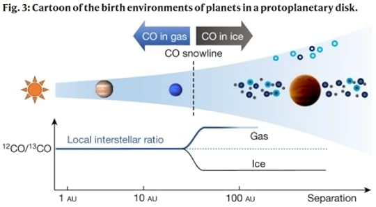Image: This is Figure 3 from the paper. Caption: The two planets inside the CO snowline denote Jupiter and Neptune at their current locations, whereas TYC 8998 b is formed far outside this regime, where most carbon is expected to have been locked up in CO ice and formed the main reservoir of carbon in the planet. We postulate that this far outside the CO snowline, the ice was 13CO-rich or 13C-rich through carbon fractionation, resulting in the observed 13CO-rich atmosphere of the planet. A similar mechanism has been invoked to explain the trend in D/H within the Solar System. Future isotopologue measurements in exoplanet atmospheres can provide unique constraints on where, when and how planets are formed. Credit: Zhang et al.