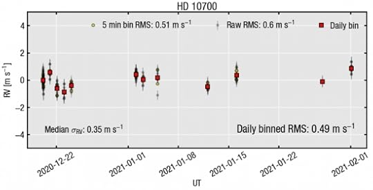 Image: NEID radial velocity measurements of the quiet star tau Ceti. Our on-sky measurements are stable to better than 50 centimeters per second, which indicates the instrument itself is even more stable. Credit: NEID Team.