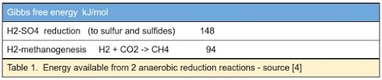 As table 1 indicates, this is a more energetic reaction than methanogenesis and may account for the very many different bacteria utilizing H2 and sulphate as an energy source.The radiolytic oxidants also react with CH4 to form simple organic molecules such as formate and acetate which can be used as food sources by bacteria, further indicating the value of radiolysis in maintaining a subsurface habitat.