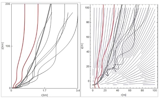 The reactor intake is centered at (r,z)=(0,0). In the ship’s rest frame the protons arrive from top – here with 56 % of light speed, the maximum speed of the EXODUS in my novel [8]. Some example trajectories are drawn. Protons spiral down the magnetic field lines as is known from earth’s magnetic field and enter the fusion chamber (red lines). The scooping is well visible. The reactor mouth has an assumed radius of 10 m. A closer look into the first 100 m (right figure) reveals an interesting detail: Only the first two trajectories enter the reactor. Protons travelling beyond the bold grey line are reflected before they reach the entrance, just as charged particles are bouncing back in the earth’s field before they reach the poles. From the Figure it is evident that at an axial length of 200 km of the Fishback solenoid the scoop radius is disappointingly low – only 2 km. Nevertheless, the compression factor (focussing ions from this radius to 10 m) of 1:40.000 is quite remarkable.