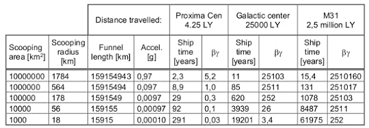 Table 1: Acceleration and travel time to Proxima Centauri, the galactic center, and the Andromeda galaxy M31, as a function of scooping area. ßγ is the specific momentum at the given ship time. A ship mass of 1100 tons, reactor entrance radius 10 m, and constant acceleration from the start was assumed. During the starting phase the thrust is low, which increases the flight time by one to several years depending on the acceleration.