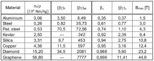 But we assumed above that this is the ship‘s entire mass. That said, the acceleration must drop long before speeding at 0,74 c. The cut-off speed βc=0,74 is an upper bound (for mathematicians: not necessarily the supremum) for the speed at which 1 g acceleration can be maintained. Lighter materials for the coil support would save mass. Fishback [5] calculated upper bounds for the speed at which an acceleration of 1 g is still possible for several materials such as aluminium or diamond (at that time the strongest lightweight material known). Values are shown in Table 2 together with (ßγ)c.