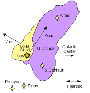 Image: Map of the local galactic neighborhood showing the Sun located near the edge of our local interstellar cloud (LIC). Alpha-Centauri is located just over 4 light-years away in the neighboring G-cloud complex. Outside these clouds, the density may be lower than 0.001 atoms/cc. Our Sun and the LIC have a relative velocity of 26 km/sec. Credit: JPL.