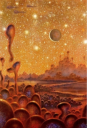 A pinprick of light appeared on the limb of Treya and quickly grew into a brilliant white star. This seemed to move out and away from Treya, which was an illusion caused by Rue’s own motion. Treya’s artificial sun did not move, but stayed at the Lagrange point, bathing an area of the planet eighty kilometers in diameter with daylight. The sun was a sphere of tungsten a kilometer across. It glowed with incandescence from concentrated infrared light, harvested from Erythrion [the brown dwarf] by hundreds of orbiting mirrors. If it were turned into laser power, this energy could reshape Treya’s continents— or launch interstellar cargoes.