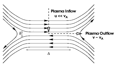 Image: Magnetic reconnection refers to the breaking and reconnecting of oppositely directed magnetic field lines in a plasma. In the process, magnetic field energy is converted to plasma kinetic and thermal energy. Credit: Magnetic Reconnection Experiment.