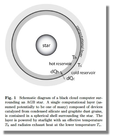 What we get is a computational device surrounding the AGB star that is roughly the size of our Solar System. In terms of observational signatures, it would be detectable as a blackbody with temperature in the range of 100 K. It’s important to realize that in natural astrophysical systems, objects with these temperatures show a spectral energy distribution that, the authors note, is much wider than a blackbody. The paper cites molecular clouds and protostellar envelopes as examples; these should be readily distinguishable from what the authors call Black Clouds of computation.
