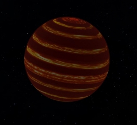 The lighter zones shown above are thought to be thin cloud decks illuminated by light from the hot interior, while the darker zones are where thicker cloud decks block interior light. The wind speeds are highest at the equator, dropping at the higher latitudes. The global wind pattern is lost at the poles, which are a region of enormous local storms, as on Jupiter. Most of Luhman 16 B, then, is dominated by global wind patterns rather than localized storms.