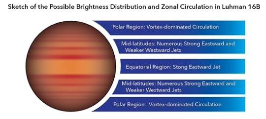 Image: This is Figure 16 from the paper. Caption: Sketch of the possible appearance of Luhman 16B, based on the emerging evidence. Zonal circulation models and comparison to Jupiter suggests that low-latitude regions are dominated by the fastest jets, and that wind speeds at mid-latitude are significantly lower. Circulation at the polar regions is likely to be vortex- and not jet-dominated. Cloud cover is likely to be correlated with the atmospheric circulation. Credit: Apai et al.
