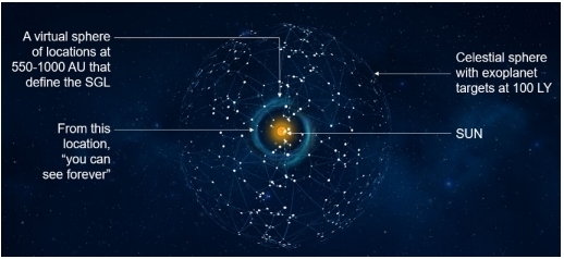 Here was an opportunity offered up by nature to achieve extraordinary magnifications. It would be a natural lensing available to any civilization that could reach the gravity focus of its star, which for the Sun means about 550 AU. As the focal line extends to infinity, studies at various wavelengths are enabled as the spacecraft continues its departure from the Solar System.