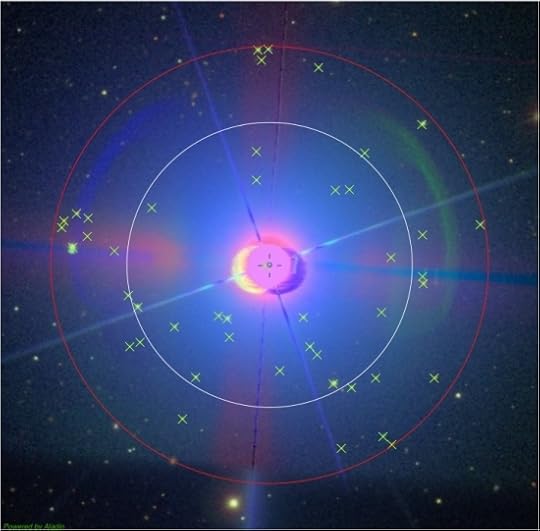 Image: This is Figure 1 from the paper. Caption: . An optical colour image of the stellar field centred on HIP109427 from the Pan-STARRS DR1 z and g broadband filters, showing the extent of the FWHM for the GBT L-band and GBT S-band receivers, circled in red and white respectively. 46 sources with geometric distances calculated from Gaia parallax data are marked with green crosses. Credit: Wlodarczyk-Sroka. Garrett & Siemion.
