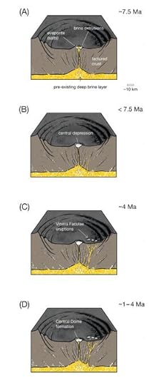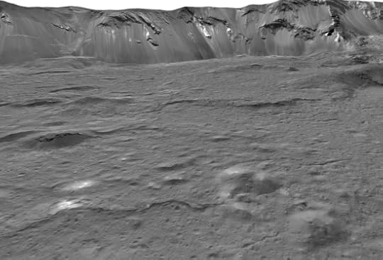 So we have brine from below the surface pushed upward, the water evaporating, and bright salty deposits left behind, with the remains of a once global ocean surviving and producing a form of cryovolcanism that is most likely still ongoing. The impact that formed Occator Crater occurred perhaps 22 million years ago, with the subsequent subsiding of the inner part of the crater resulting from the loss of material from the interior.