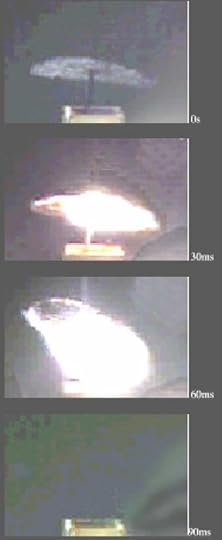 Image: Carbon disk sail lifting off of truncated rectangular waveguide under 10 kW microwave power (four frames, 30 ms interval, first at top). Credit: James and Gregory Benford.