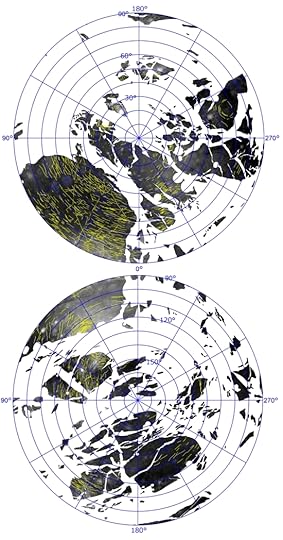 Image: Azimuthal equidistant map centered at 20° south 180° west showing Ganymede’s Dark Terrain and furrows (indicated by yellow lines). (Bottom) Azimuthal equidistant map of Ganymede’s surface centered at 20° north and 0° west. This shows the opposite hemisphere of Ganymede from the top image. The white areas indicate Bright Terrain. Credit: NASA.