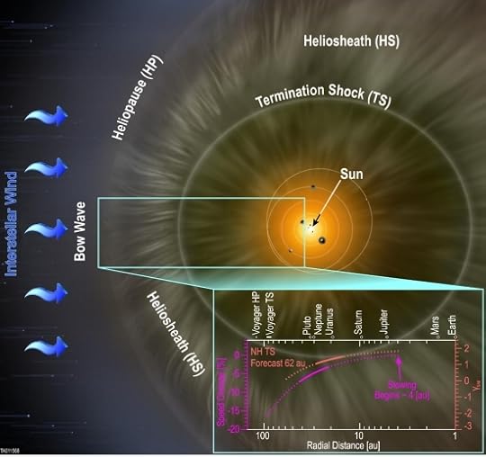 Image: And here’s something we’ve learned from New Horizons. The SWAP instrument aboard the spacecraft has confirmed that the solar wind slows as it travels farther from the Sun. This schematic of the heliosphere shows the solar wind begins slowing at approximately 4 AU radial distance from the Sun and continues to slow as it moves toward the outer solar system and picks up interstellar material. Current extrapolations reveal the termination shock may currently be closer than found by the Voyager spacecraft. However, increasing solar activity will soon expand the heliosphere and push the termination shock farther out, possibly to the 84-94 AU range encountered by the Voyager spacecraft. Credit: Southwest Research Institute; background artist rendering by NASA and Adler Planetarium.