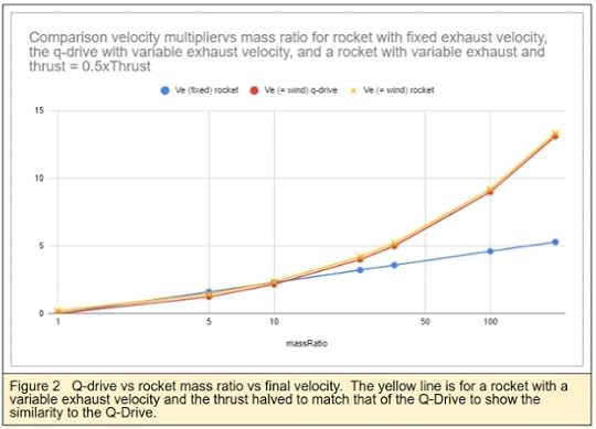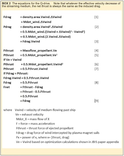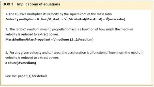 Equation A16 [1] and Box 3 equation 1 show that the Q-Drive has a velocity multiplier that is the square root of the mass ratio. This is highly favorable compared to the rocket equation. The equations 2 and 3 in Box 3 show that the required propellant and hence mass ratio is reduced the less the medium velocity is reduced to extract power. However, reducing the delta V of the medium also reduced the acceleration of the craft. This implies that the design of the ship will be dependent on mission requirements rather than some fixed optimization.