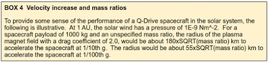 Box 4 provides some illustrative values for the size of the mag sails in the solar system for the Q-Drive and the expected performance for a 1 tonne craft. While the magnetic sail radii are large, they are achievable and allow for relatively high acceleration. As explained in [4], the plasma magnet sails increase in size as the medium density decreases, maintaining the forces on the sail. Once in interstellar space, the ISM is yet more rarefied and the sails have to commensurately expand.