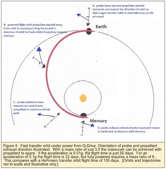 To reach Mercury quickly requires the probe to reduce its orbital speed around the sun to drop down to Mercury’s orbit and then reduce velocity further to allow orbital insertion. The Q-Drive ship points its bow towards the sun, and ejects propellant off-axis. This quickly pushed the probe into a fast trajectory towards the sun. Further propellant ejection is required to prevent the probe from a fast return trajectory and to remain in Mercury’s sun orbital path. From there a mix of propellant ejection and simple drag alone can be used to place the probe in orbit around Mercury. Flight time is of the order of 55 days. Figure 4 illustrates the maneuver.