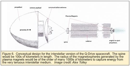 Figure 6 shows my attempt to illustrate a conceptual Q-Drive powered spacecraft for interstellar flight. The propellant is at the front to act as a particle shield in the ISM. There is a science platform and communication module behind this propellant shield. Behind stretches a many kilometers long spine that has a plasma magnet at either end to harvest the energy in the ISM and to accelerate the propellant. Waste heat is handled by the radiator along this spine.
