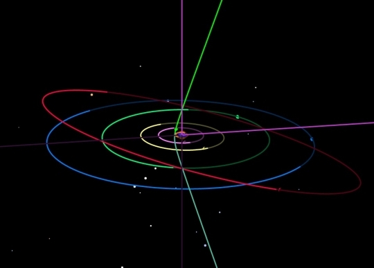 Image: Observations suggest that comet C/2019 Q4 (Borisov) may be from outside the Solar System. A hyperbolic solution for the object first labeled gb00234 passes between Mars and Jupiter. (Green=gb00234; Blue=Neptune). Credit: Tony873004 – Own work, CC BY-SA 4.0.