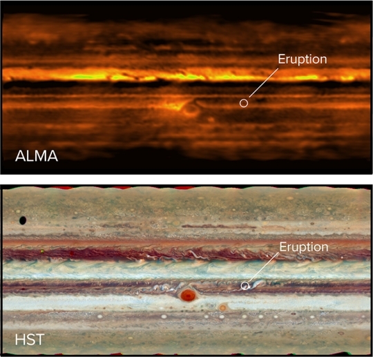 Image: ALMA’s view of Jupiter at radio wavelengths (top) and the Hubble Space Telescope’s view in visible light (bottom). The eruption in the South Equatorial Belt is visible in both images: a dark spot in radio, a bright spot in visible. Credit: ALMA image by Imke de Pater and S. Dagnello; Hubble image courtesy of NASA.