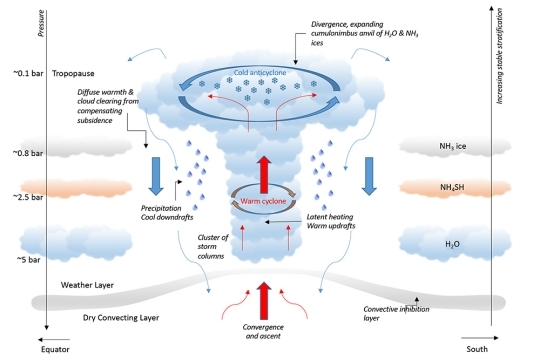 Image (click to enlarge): An illustration of “moist convection” in Jupiter’s atmosphere shows a rising plume originating about 80 kilometers below the cloud tops, where the pressure is five times that on Earth (5 bar), and rising through regions where water condenses, ammonium hydrosulfide forms and ammonia freezes out as ice, just below the coldest spot in the atmosphere, the tropopause. Credit: Adapted from illustration by Leigh Fletcher, University of Leicester.