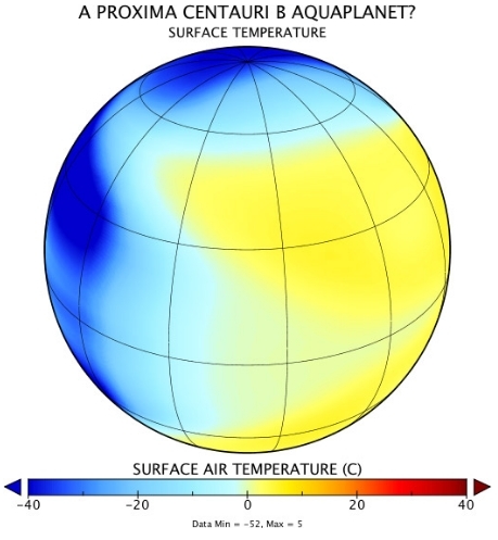 Image: The discovery of the planet Proxima Centauri b orbiting the star closest to Earth has generated much research about whether it has a chance to be habitable. With ROCKE-3D we have imagined Proxima Centauri b as an “aquaplanet” covered by water. Because the planet is close to its star, it may show the same face to the star all the time, as the Moon does to the Earth. If so, the dayside remains a few degrees above freezing (yellow colors). Elsewhere, the ocean is perpetually covered by ice (dark blue colors), except near the equator where winds and ocean currents push sea ice eastward onto the dayside where it breaks up and melts (pale blue to light yellow colors). Credit: NASA Nexus for Exoplanet System Science (NExSS) / NASA Goddard Institute for Space Studies (GISS).