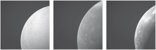 Image: Impressions of how the Jupiter Icy Moons Explorer will see moons Europa (left), Ganymede (middle) and Callisto (right) with its Navigation Camera (NavCam). To generate these images, the NavCam was fed simulated views – based on existing images of the moons – to process realistic views of what can be expected once in the Jupiter system. Credit & copyright: Airbus Defence and Space.