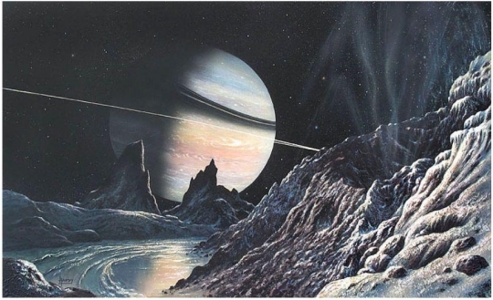 Image: “Snow on Enceladus.” Credit: David Hardy.