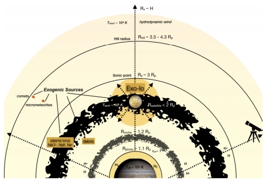 Image: This is Figure 4 from the paper. Partial caption: 2-D “Birds-Eye” Architecture of a Sodium Exosphere at a Close-in Gas Giant Exoplanet System. Endogenic: An extended sodium layer above the hot Jupiter is shown to illustrate a well-mixed Na I component (yellow). Exogenic: An exo-Io sodium cloud (yellow) is shown at ∼ 2Rp. Parameters for an escaping atmosphere are overlayed, inspired by the 1-D hot Jupiter atmosphere by Murray-Clay et al. (2009). Several other desorbing-exogenic sources (comets, micrometeorites, debris) illustrate the possible endogenic-exogenic interaction contributing to the light yellow exosphere. A full Monte Carlo simulation is likely necessary to describe the precise ion-neutral and electron-neutral interactions in detail, yet a upper atmosphere model by Huang et al. (2017) along with high-resolution observations of HD189733b (Wyttenbach et al. (2015)) and WASP 49-b (Wyttenbach et al. (2017)) are suggestive of the parameter space. Credit: Oza et al.