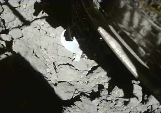 So we keep doing what we can with the resources that have been allocated, knowing how much more could be done. Today we look at an asteroid. What follows is imagery from Japan’s Hayabusa 2 mission, which touched down just a few days ago on the asteroid Ryugu, a second landing after the one performed in February. Here we’re seeing views from the spacecraft’s small monitor camera (CAM-H), which operated throughout touchdown, with a field of view looking downwards toward the sampler horn. I’ll just run these in sequence.