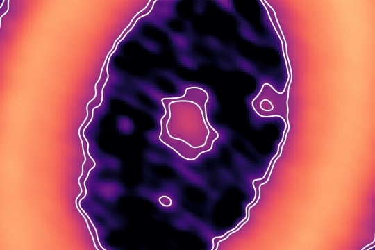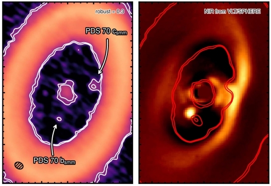 And here is a color-enhanced image of millimeter-wave radio signals showing the disk of gas and dust around PDS 70c: