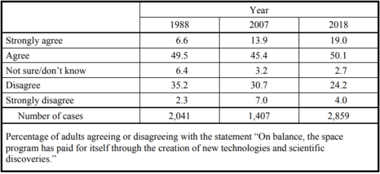 Here’s the survey’s Table 2, labeled “Public agreement with statement concerning the value of new technologies from the space program, 1988-2018.”