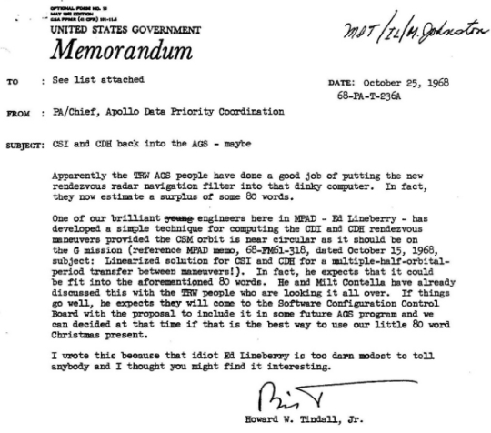 One of our brilliant young engineers here in MPAD — Ed Lineberry — has developed a simple technique for computing the CSI and CDH rendezvous maneuvers provided the CSM orbit is near circular as it should be on the G mission… In fact, he expects that it could be fit into the aforementioned 80 words. He and Milt Contella have already discussed this with the TRW people who are looking it all over. If things go well, he expects they will come to the Software Configuration Control Board with the proposal to include it in some future AGS program and we can decide at that time if that is the best way to use our little 80 word Christmas present.
