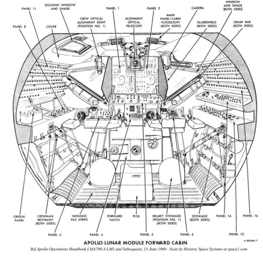 And here is the LMS cockpit (crew cabin). Panel 6 is where the AGS keyboard and display are. Click to enlarge the image.