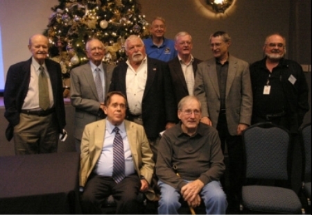 Image: A 40th anniversary panel on Apollo 8 organized by Al Jackson in 2008. Left to right: Marty Jenness, Dr. Christopher Kraft, John Llewellyn, Dr. Glynn Lunney (with Ken Young behind him), Emil Shiesser, Al Jackson. Front row: Hal Beck, Rod Rose. Credit: Al Jackson.