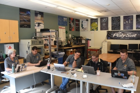 Image: This image shows The Planetary Society’s LightSail 2 team on console prior to sail deployment on 23 July 2019 at the Cal Poly CubeSat lab in San Luis Obispo, California. From left: Barbara Plante, Founder and President, Boreal Space; Alex Diaz, Avionics Engineer, Ecliptic Enterprises Corporation; John Bellardo, Associate Professor, Cal Poly San Luis Obispo; Dave Spencer, LightSail Project Manager, Associate Professor at Purdue University; Bruce Betts, LightSail Program Manager, Planetary Society Chief Scientist. Credit: The Planetary Society.