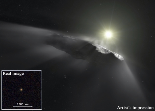 Image: This artist’s impression shows the first interstellar object discovered in the Solar System, ʻOumuamua. Observations made with the NASA/ESA Hubble Space Telescope, CFHT, and others, show that the object is moving faster than predicted while leaving the Solar System. The inset shows a color composite produced by combining 192 images obtained through three visible and two near-infrared filters totaling 1.6 hours of integration on October 27, 2017, at the Gemini South telescope. Credit: ESA/Hubble, NASA, ESO/M. Kornmesser, Gemini Observatory/AURA/NSF.