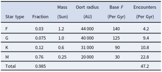 Table 1. Comparative responsibility of star types for cometary bombardment of our Solar System. Credit: Robert Zubrin.