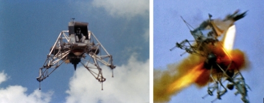 Image: Astronaut Neil Armstrong flying LLRV-1 at Ellington AFB shortly before the crash (left) and ejecting from the vehicle just seconds before it crashed (right). Credit: NASA.