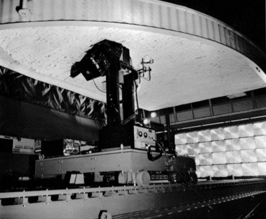 A five-ton system of lenses, mirrors and mounts made up the visual display system, which was attached to the LMS crew station. The heart of the simulator was a crew station that resembled in all details the actual spacecraft. Here is a photo Al sent showing the Mission Effects Projector. Another subsystem of the LMS visual suite, it used a film projection device for the early descent phase until switching to an optical unit that moved over a model of the Moon’s surface.: