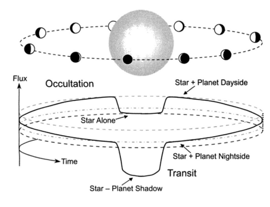 Image: A comparison between transits and secondary eclipses (also sometimes called occultations). In a planetary transit, the planet crosses in front of the star (see lower dip) blocking a fraction of the star’s brightness. In a secondary eclipse, the planet crosses behind the star, blocking the planet’s brightness (see dip in the middle). The latter dip in brightness is fainter due to the faintness of the planet. Credit: astrobites/Josh Winn.