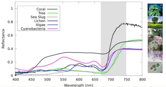 Image: This is Figure 1 from the paper. Caption: Examples of red edge features—the increase in reflectance caused by chlorophyll, highlighted in the shaded region—exhibited by (A) corals, (B) deciduous vegetation (trees; representative of the present-day red edge feature in Earth’s spectrum), (C) the photosynthetic sea slug, Elysia viridis, (D) lichen (Acarospora sp.), (E) algae (Rhodosorus marinus), (F) cyanobacteria (Chroococcidiopsis sp.). Credit: Jack O’Malley-James/Lisa Kaltenegger.