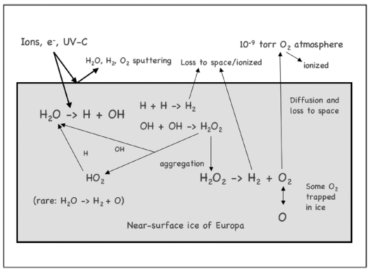 Europa’s surface ice is subjected to about 0.125 W/m2 of ion radiation, radiolytically producing oxygen on the surface and a very thin atmosphere (the mechanism shown in figure 1).