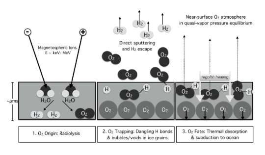 Figure 2. Schematic diagram of O2 trapping and thermal desorption: 1) Primary origin of O2 (and H2) is magnetospheric ion radiolysis. 2) Due to preferential loss of H2, the regolith becomes oxygen rich enhancing the production of O2. Formed and returning O2 can become trapped at incomplete (dangling) H bonds (shown) as well as in voids (as shown and observed by Spencer & Calvin 2002). 3) The accumulated O2 can then be thermally desorbed from the weak dangling bonds due to solar heating, maintaining a quasi vapor pressure equilibrium (Oza et al. 2018a), with a smaller gas-phase contribution from direct sputtering of O2. A fraction of the trapped O2. is likely subducted. [Johnson et al – [1]]